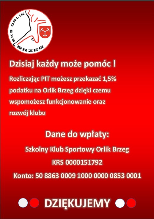 Rozliczając PIT możesz przekazać 1,5% podatku na Orlik Brzeg dzięki czemu wspomożesz funkcjonowanie oraz rozwój klubu 🔥 Dane do wpłaty: Szkolny Klub Sportowy Orlik Brzeg KRS 0000151792 Konto: 50 8863 0009 1000 0000 0853 0001 Z góry dziękujemy 🔥💖